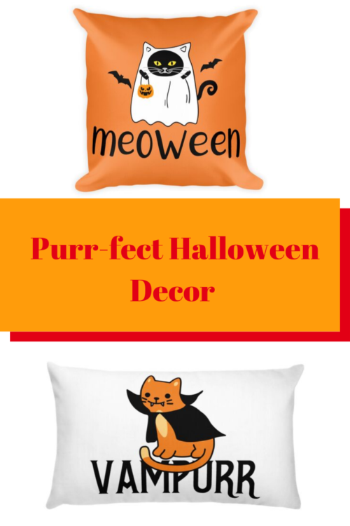 The items above are designed to get your cat in the Halloween spirit, but it’s also fun to add some decor to get your living space ready. Check out these cat-themed throw pillows available from our new Fully Feline Shop. The Meoween kitty (pillow size 18 x 18) is too cute to be scary, but he’s definitiely in the market for some treats!