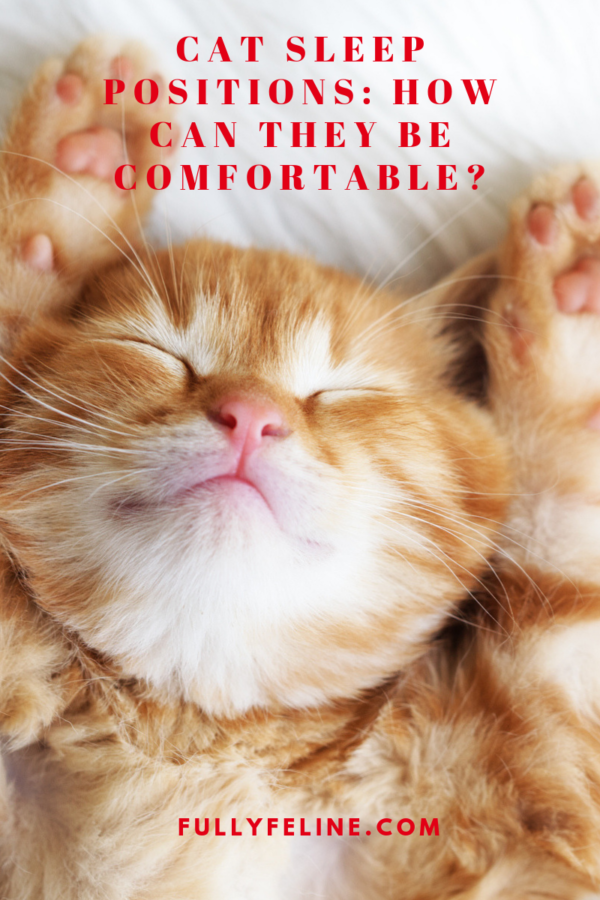 Have you ever heard of the kitty loaf? This seems to be the winner of cat sleep positions. This is when your cat is lying lengthwise on his belly. His paws will be tucked under him. His head could be resting on something or perched upright. Even if it looks uncomfortable to you, if it doesn’t seem to bother your cat, leave him be.