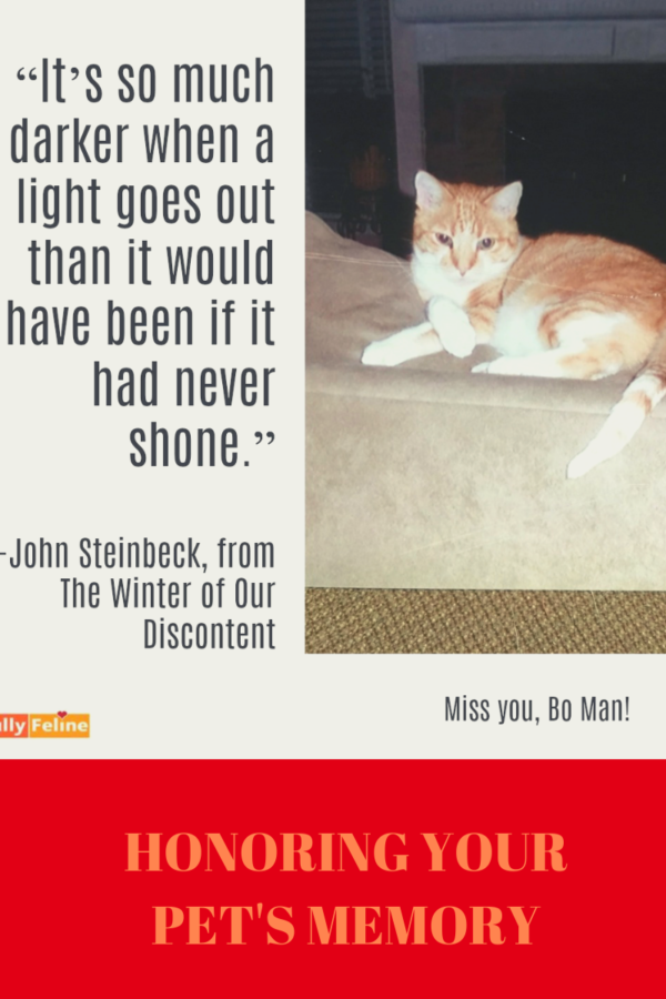 - Create a website or Facebook page as a tribute. I started fullyfeline.com to honor my cat Bo. Many people establish Facebook pages in honor of their deceased pet.