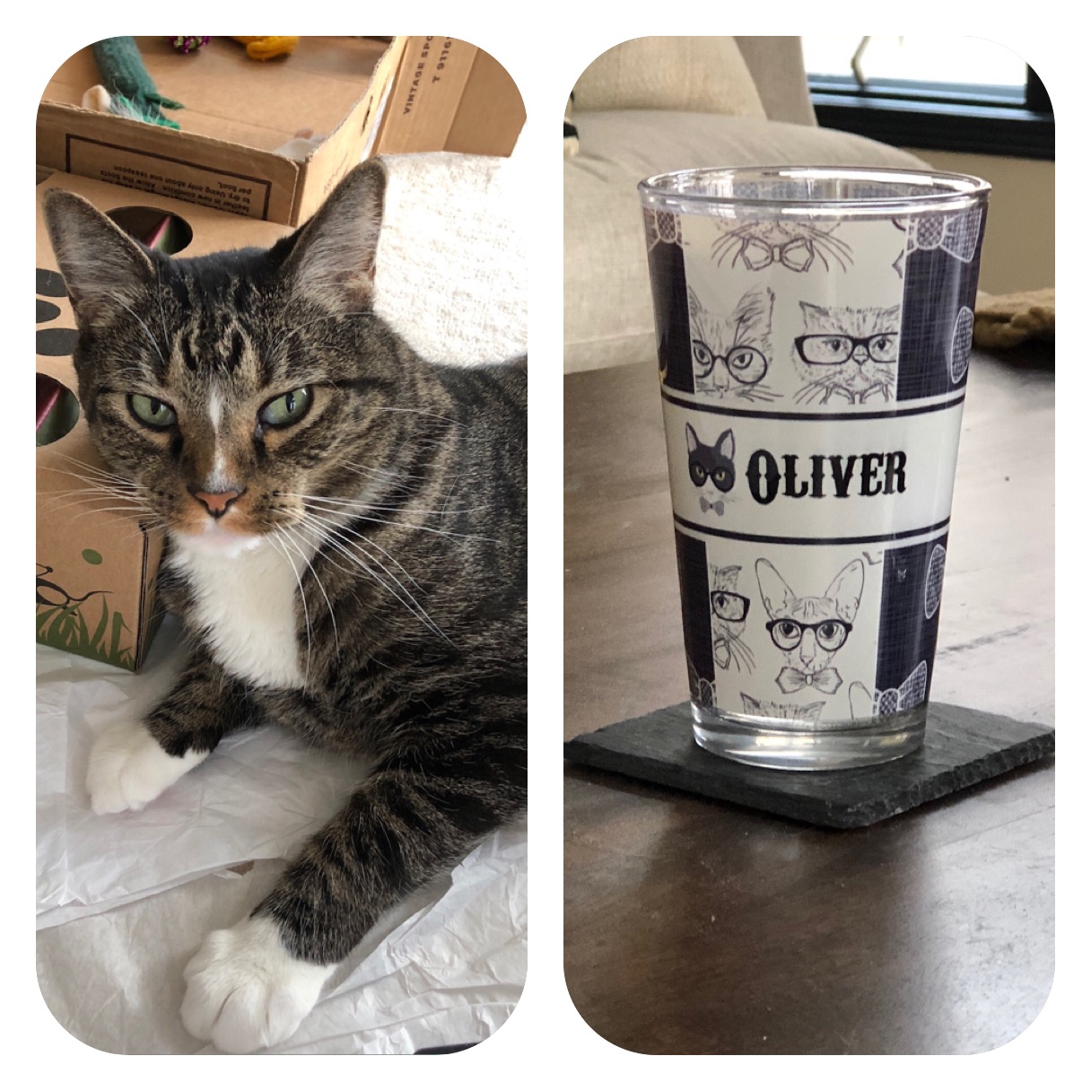 Serve his meal in special ceramic bowls or on plates. For a little extra treat, garnish his meal with his favorite snack (unfortunately the smellier it is, the more cats like it). Some cats, like Oliver (pictured below) like to drink water out of a glass, even better when the glass is personalized!